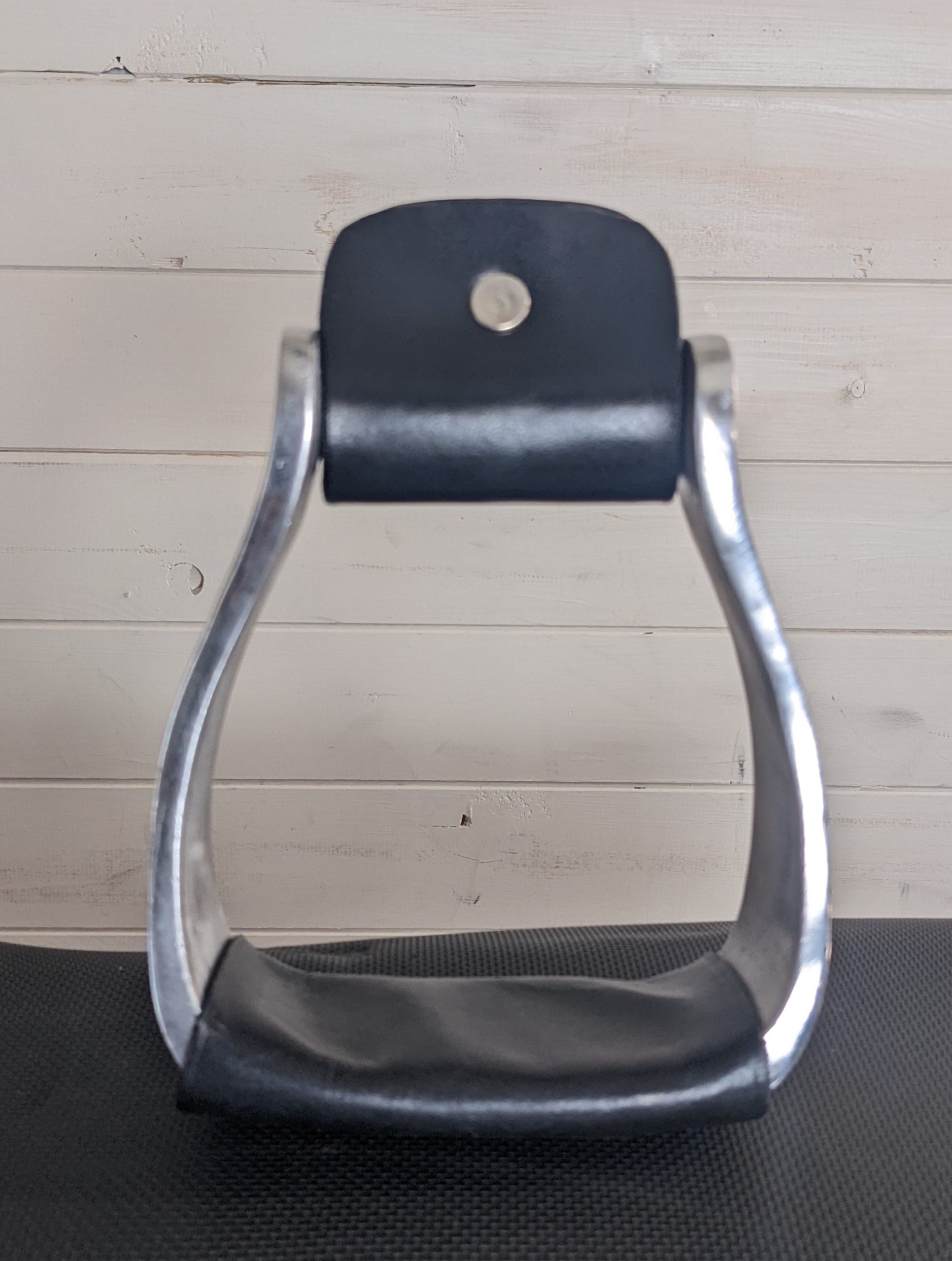 Solid Aluminum western stirrups. Excellent for a person wanting a wider stirrup or more of a western looking stirrup. Leather covered foot bed prevents slippage. These stirrups are lightweight and very sturdy.
